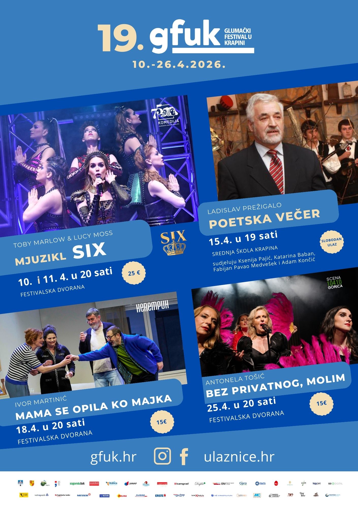 Zbog velikog interesa publike, mjuzikl SIX dobio je i dodatnu izvedbu, a u Festivalskoj dvorani očekuju nas i predstave Mama se opila ko majka (Kazalište Kerempuh, 18. travnja) te Bez privatnog, molim (Scena Gorica, 25. travnja).
